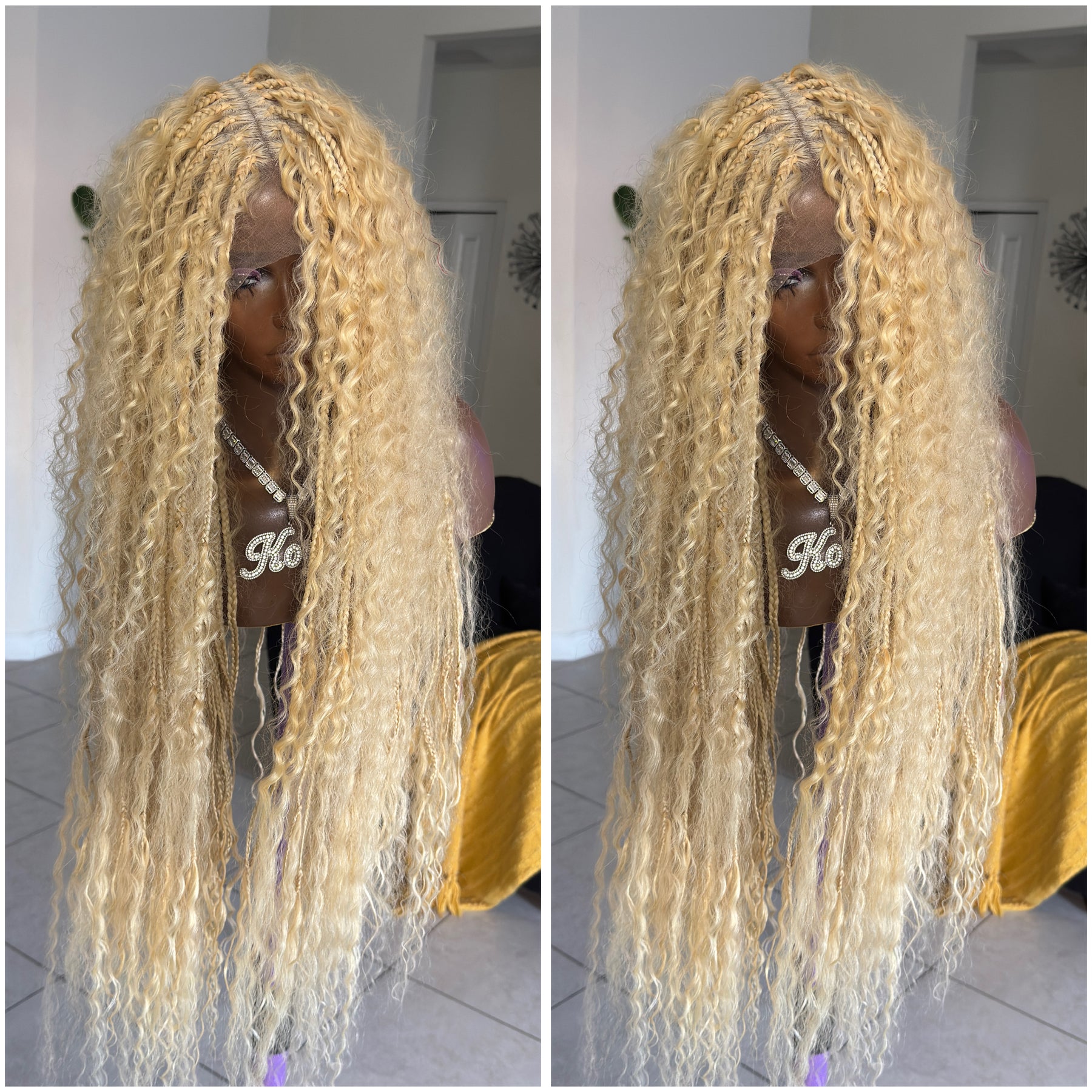 This is a full lace unit. It will feature an elastic band and combs. The full lace features adjustable straps, combs and baby hair. It fits head size 22-23inches. It comes in color 1, 99j and 1b. Please note that these are traditional box braids and not Knotless Braids. The curly pieces are not human hair and you will have to maintain the curls with mousse! Please contact me if you’d like a different color via email takoyagreen@gmail.com.